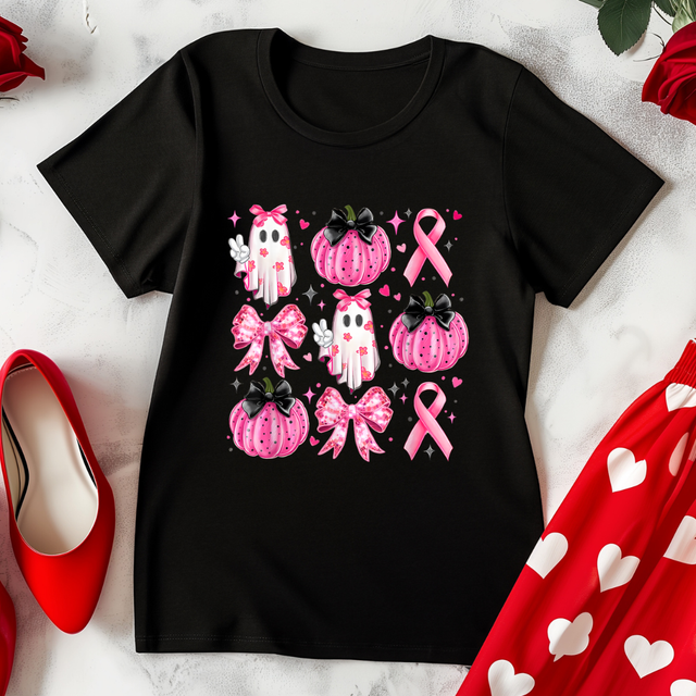 Ce modèle original mêle citrouilles roses, rubans du ruban rose et fantômes girly, pour une touche à la fois ludique et engagée.