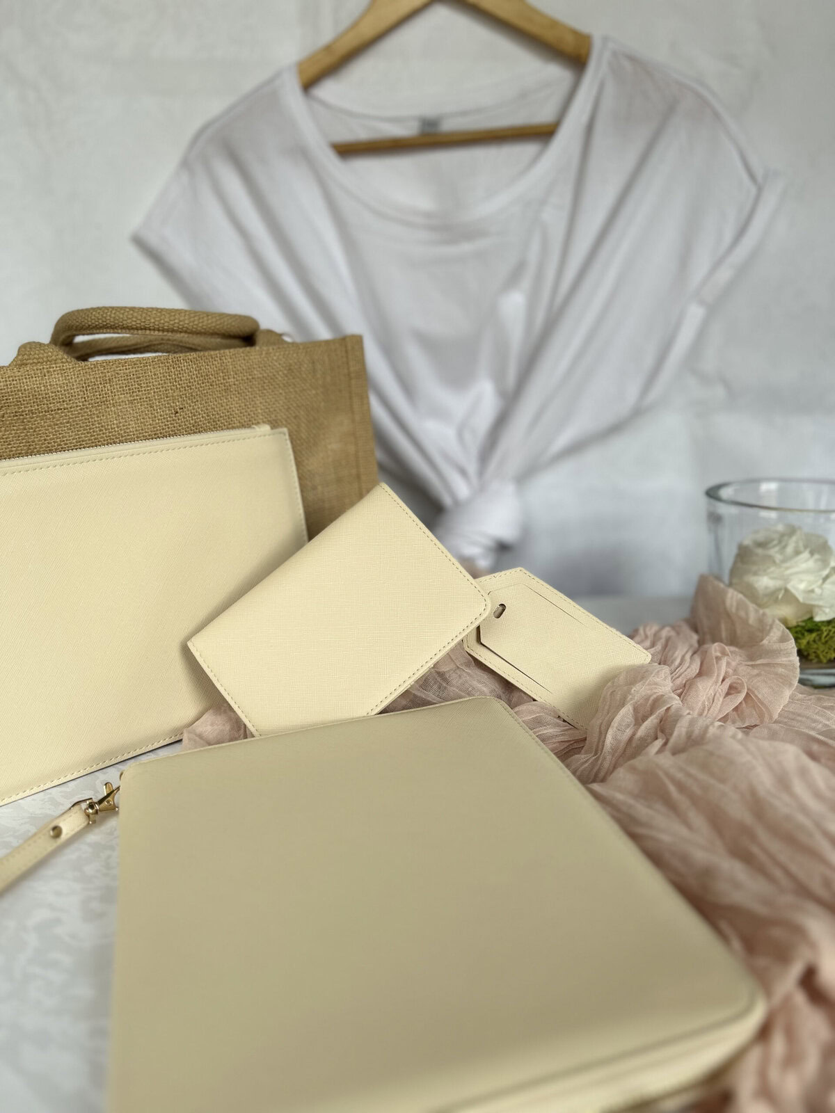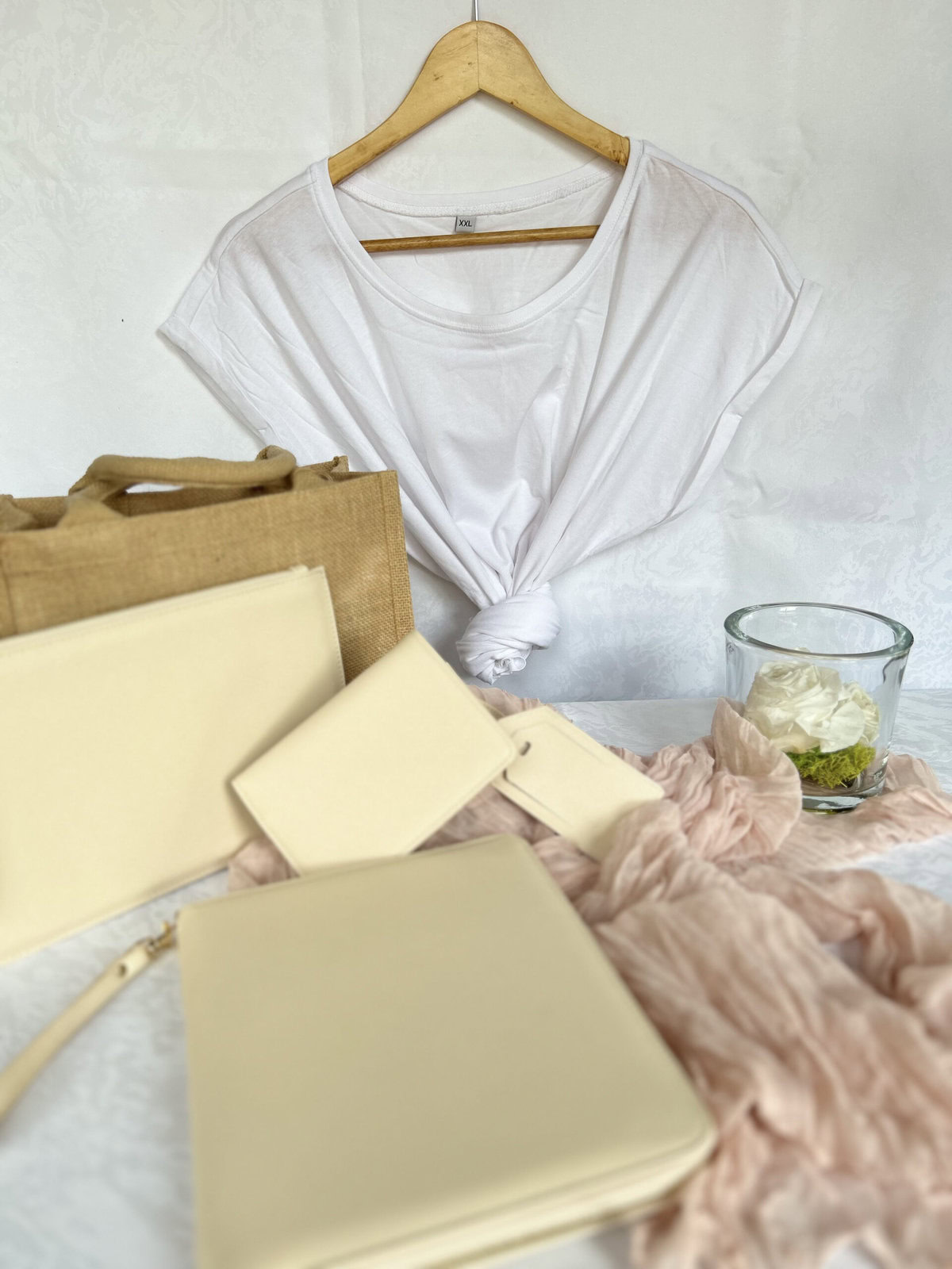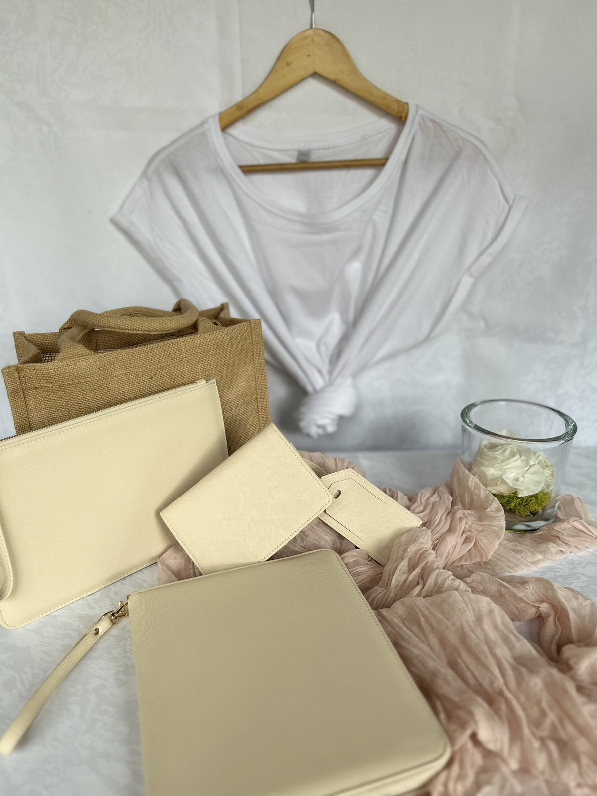 Cet ensemble sera un cadeau parfait pour une future mariée ou une globe trotteuse. En effet personnaliser le lot avec ses futures initiales, le t-shirt avec la date du mariage et un élégant “appelez moi Madame” ou autre …