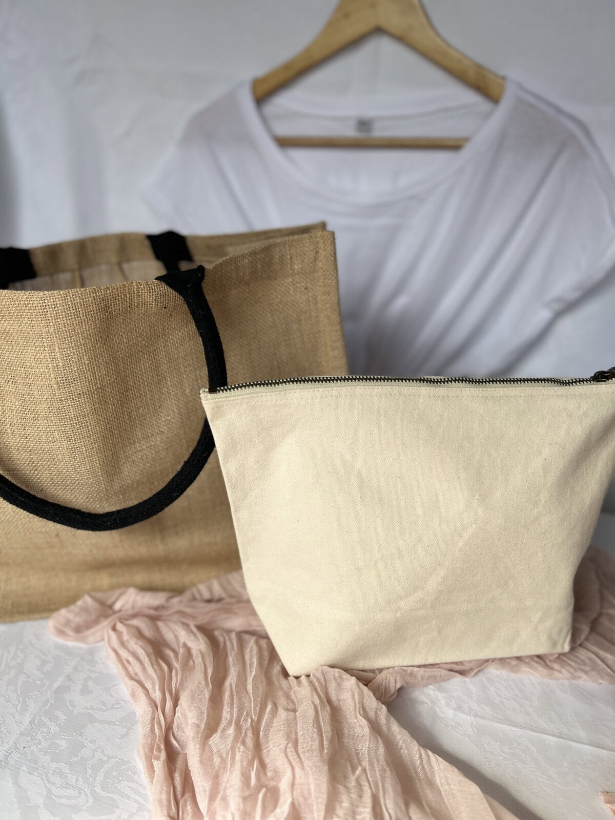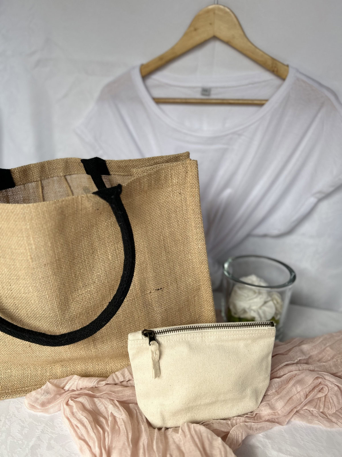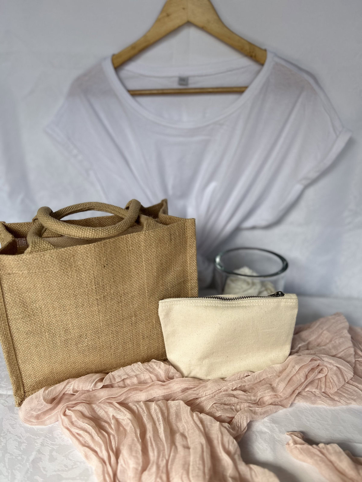Le Set Jute et coton se compose d’un sac en jute, d’un t-shirt et en option d’une trousse à soufflet.