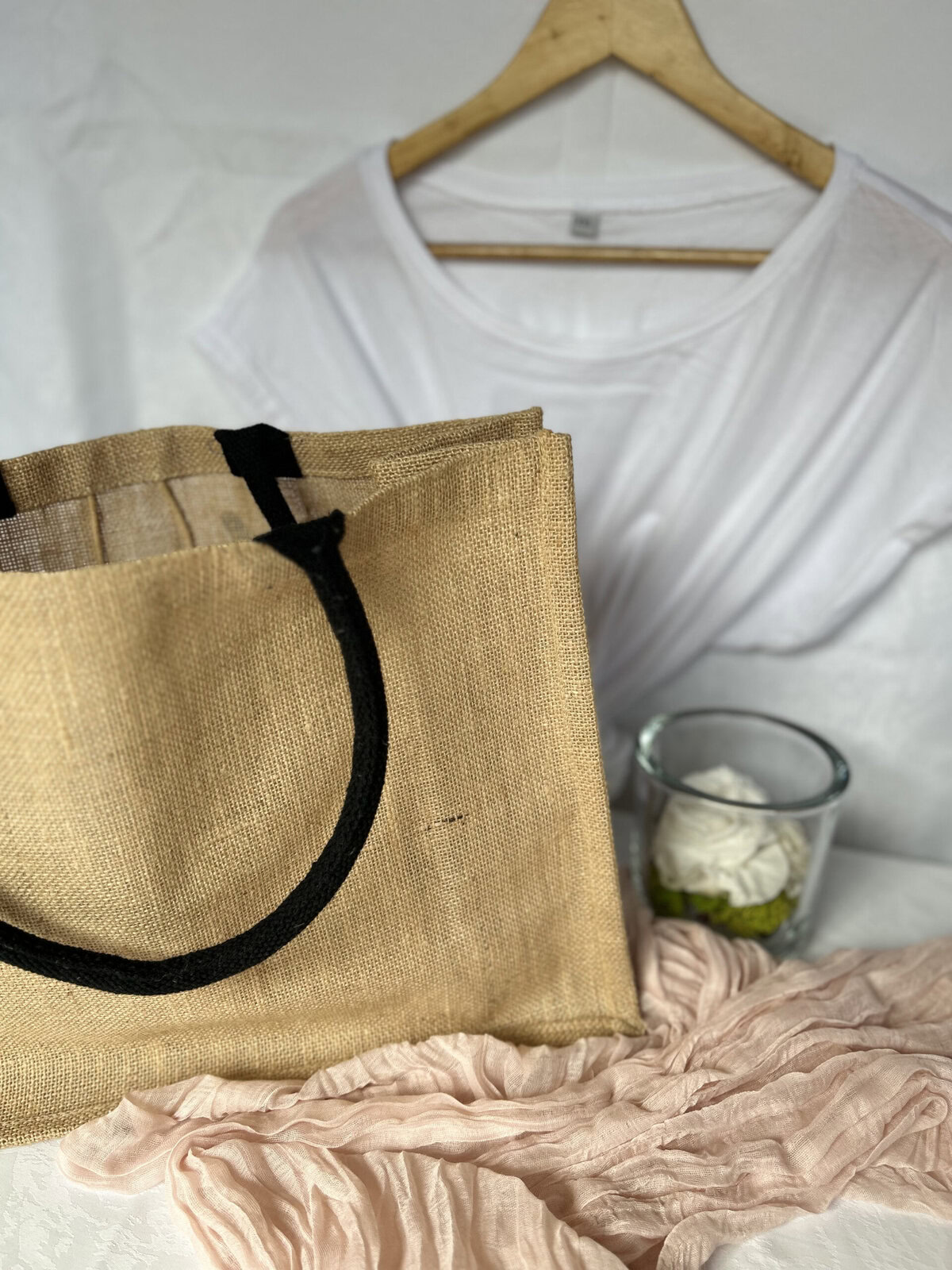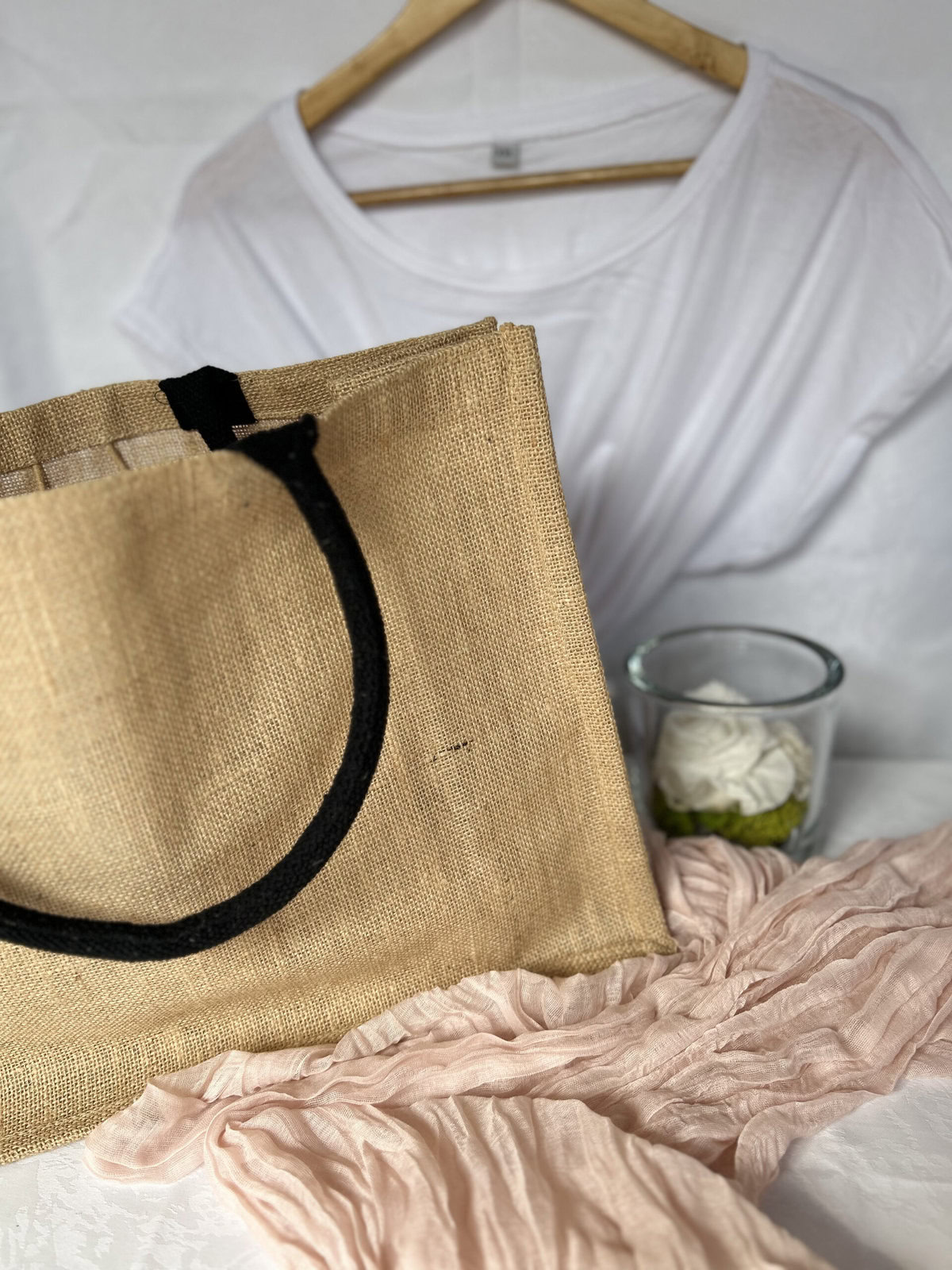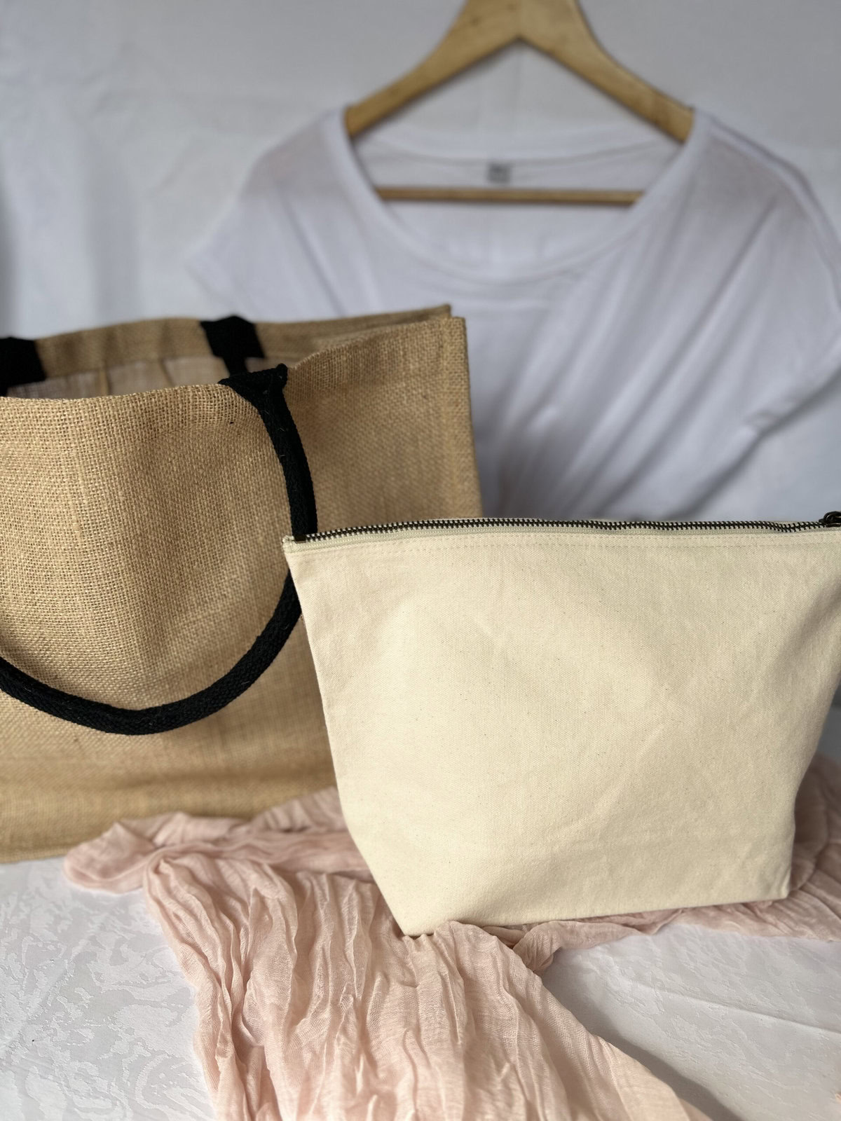 Le Set Jute et coton se compose d’un sac en jute, d’un t-shirt et en option d’une trousse à soufflet.